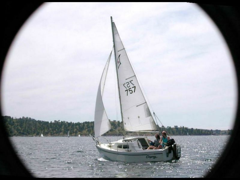 Vince and Sharon V. on P19 "Osprey". Taken by Judy B with a Nikon Coolpix 950 digital camera with 2x zoom lens (equivalent to a 100-260 mm zoom lens on a 35 mm camera.) The lens was too "long" at this close range, which is why you can see the a black "vignette" around the picture. Should have used the regular lens.