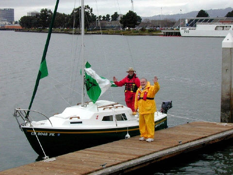 Dave Norris and friend ready to set sail in his almost new P19 on a windy and wet day. The boat's named "WightCap"