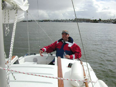 Look at that BIG smile on Chris' face. It was Chris' first sail in "Deep Blue". We put the first reef in the main and used a full lapper. We could have used the full main, but this was Chris' first time out in his new boat, and it was best to keep her a little undercanvassed until he got used to the feel of the boat. The wind on the Oakland Estuary was about 15 knots near the ramp, and about 20 knots with a few higher gusts as we neared the mouth to San Francisco Bay. The boat was perfectly powered up and Chris was already comfortable at the helm by the time we were sailing in the heavier winds. Jerry sailed past us and yelled to me to put her on her ear to about 30 degrees to show how beautifully she would round up and get back on her feet. I took the helm and put "Deep Blue" through her paces, while Jerry took pictures from his boat. A few minutes later, I gave the helm back to Chris. He cranked up his courgage and hardened her sails, with me calling out the degrees on the clinometer til he reached 20 and held her there for a few moments. Then he backed her off to about 12-15 degrees of heel and kept her there. Boy, did that boat fly!! We were doing an easy 5+ knots!