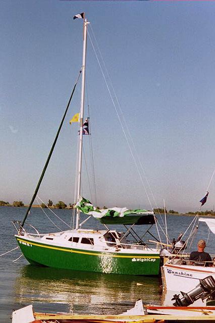 Dave Norris' WightCap, anchored out stern-and-bow. Dave took advantage of the sandy bottom to practice his anchoring technique. The rest of us were too lazy -- we just pulled our boats right up on the beach!