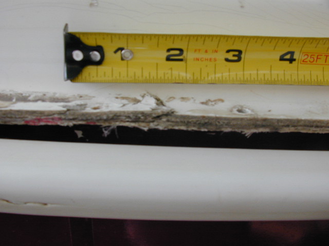 Looking at it from the side (and from underneath, which you can't see in this shot), the damage extends 1/2" further than visible from above. I've marked in red felt tip the extent of the damage on the left. I pried a screw driver in there to check if there were any cracks further along the joint. Nope, it's strongly epoxied (?) together and that's the extent of the damage. Shouldn't be too hard to fix, even though the curves here will make it difficult to sand the new glass. It should be cosmetically fine -- as long as nobody pulls off the rubrail to look!