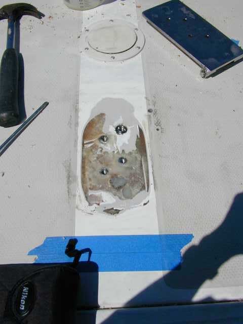 I also filled in the old thru-deck holes for the VHF coaxial cable, the OEM mast wiring (which was not marine grade), and the deck hardware the previous owners had installed -- I filled them all with thickened epoxy, after cleaning the out old sealant with a drill bit. I found no rot under the old maststep or around any of the holes I filled. It's all quite solid under there, even though the old screw went directly into uncoated plywood core with some polysulfide caulking. There is no exposed woodgrain now under the mast step. All fasteners are seated in solid epoxy and fiber fillets. There should be virtually no chance of core rot in the future. Finally, I used waterproof epoxy putty to fair the area resonably flat. |