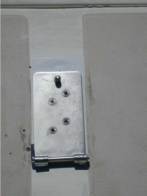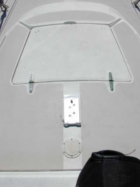 Another shot of the bottom plate of the hinged mast step. It's cosmetically ugly right now, but I'll fix all that when I repaint the boat with LPU this coming winter. At least all the old holes are sealed with epoxy and there's virtually no chance of future core rot. For now, I've painted the surrounding area with white enamel paint to protect the epoxy from UV. So we can go sailing as soon as I get enough of the new hardware on her to actually sail her! It'll be really nice to be able to easily remove the whole assembly for final fairing and repainting. |