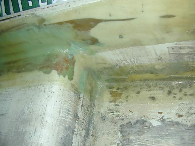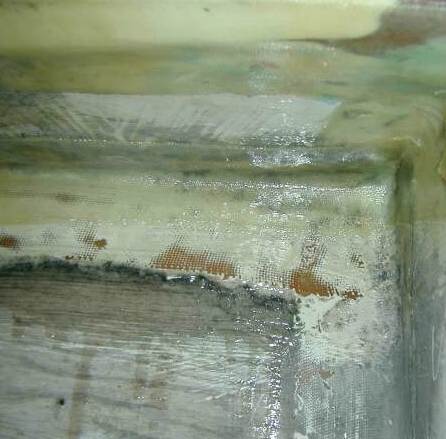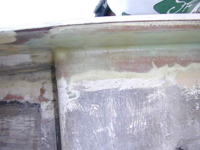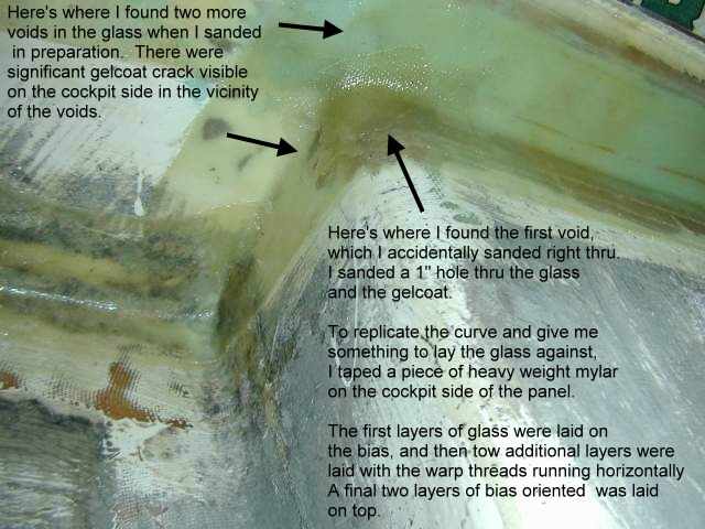 A close up of the new tabbing which now connects the plywood bulkhead to the underside of the cockpit seat. After putting one coat of plain epoxy resin (West System) on the joint area and building a curved fillet of thickened epoxy inside the 90 degree joint, I put in two layers of 8.6 oz woven e-glass tape and epoxy resin. |