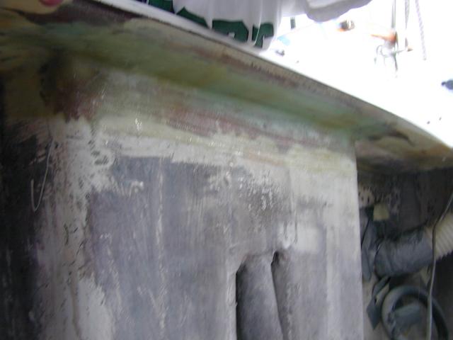 A picture taken inside the aft lazarett, looking forward at the undside of the traveller. There were numberous cracks in the gelcoat near the traveller from flexing, so I filled theconcave space under the traveller with West System epoxy and wood, then laid about 1/8" of glass/epoxy over it. I also reinforced the corners. |