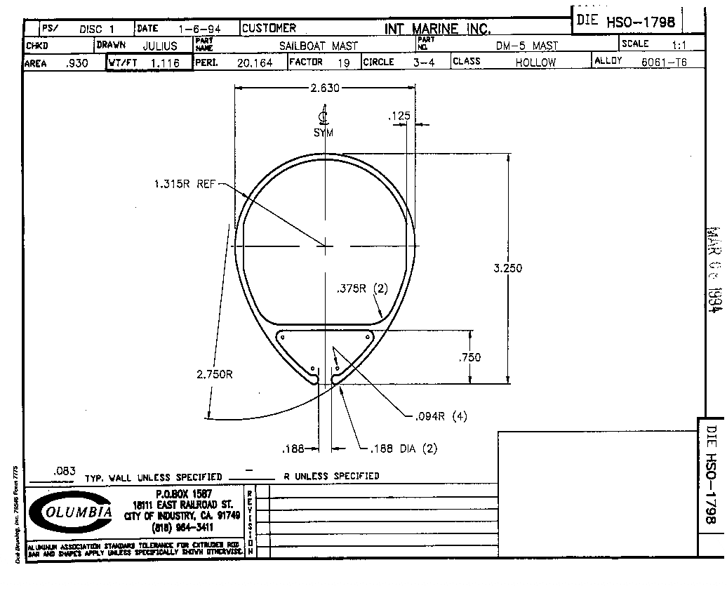 The Pooter 19 sailboat mast is manufactured for IM by Columbia Pacific Company. It is made of an aluminum alloy whose physical properties (alloy composition and temper) conform to the standards for "6061T6 Aluminum Alloy."