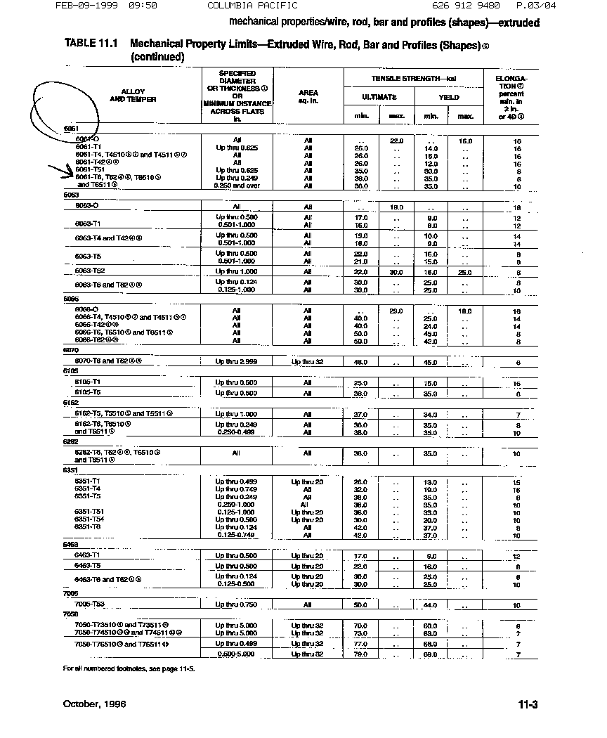 The DM5 mast by Dwyer Mast Company, which is very similar to the P19 mast supplied by Columbia Pacific, is also made of 6061T6 aluminum alloy, according to a cnoversation I had with Mr. Dwyer. In direct answer to my question, Mr. Dwyer expressed the opinion that one could bend the DM5 mast with an adjustable backstay several inches without damaging it. He said that four to six inches of bow in a 22 foot mast was well within the mast's structural limitation.
