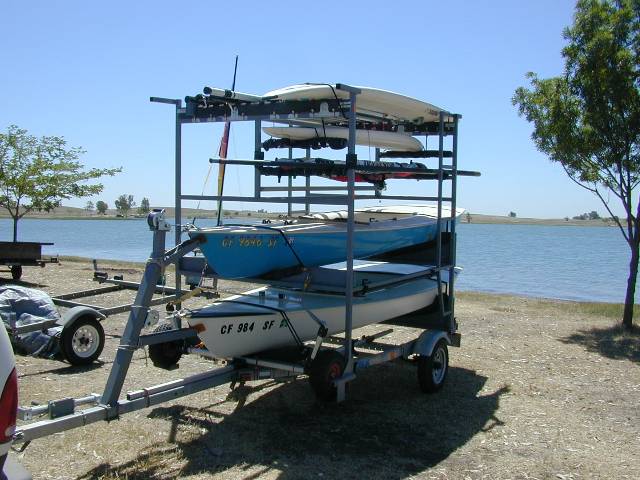 The trailer holds two Force 5's (or Lasers), two or three windsurfers, a Sietech dolly for hand launching the Force 5's, about 15 masts and booms, and a pile of sails for the boats and windsurfers. The steel rack is custom built to my design by Barstad & Donicht of San Leandro, CA. It will support the weight of two adults and three boats, which the aluminum racks from Sietch don't.