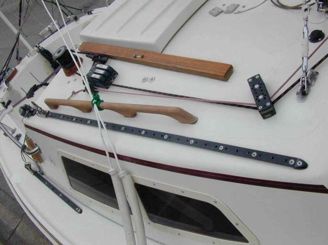 Another advantage of putting the tracks here is that I can reach the sliding cars easily from the companionway and cockpit. I can adjust the lead forward and aft for different wind conditions to keep the right amount of tension on the foot and leech of the jib, and get just the right amount of twist in the sail.