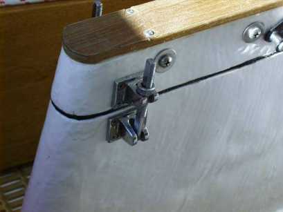 The first design is found in the HMS-18's which were built when Herb Stewart owned the company in the 1970's. It's found on hulls #1-78. It's a line and cleat. It works well for holding the keel trunk down in the event of a knockdown. It prevents water from splashing up from the trunk while sailing in rough water. It doesn't cause additional damage to the keel trunk in the event of a grounding, as far as we know in the Potter Folklore.