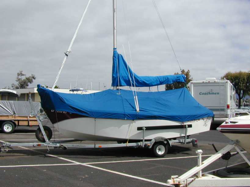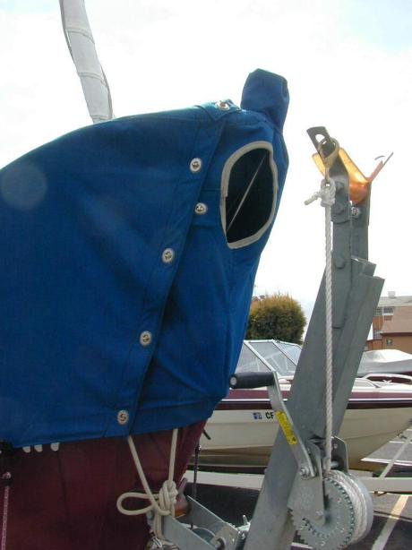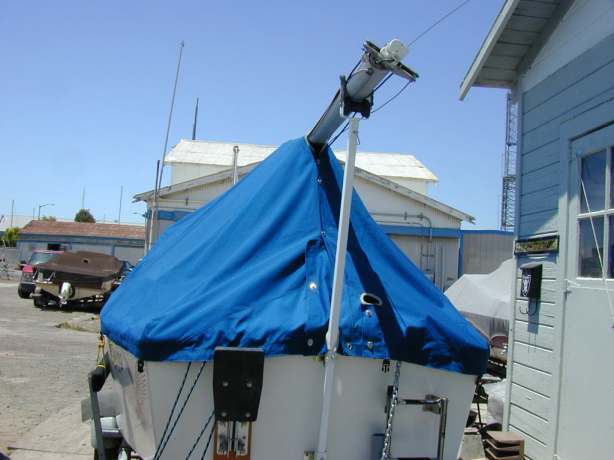 The cover started out as a fitted mast-down storage cover purchased from International Marine in 1997. My local canvas-smith modified it so it could be used for mast-up storage as well as mast down storage.