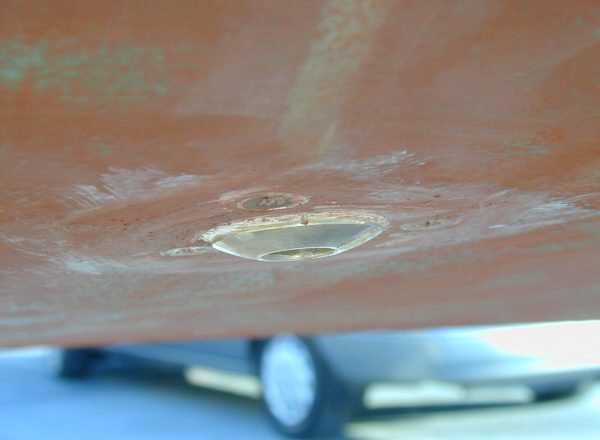 Here's one little place where loose bottom paint came off when I faired the hull. I dewaxed the spot, sanded, filled with epoxy thickened with low density filler and then filled. |