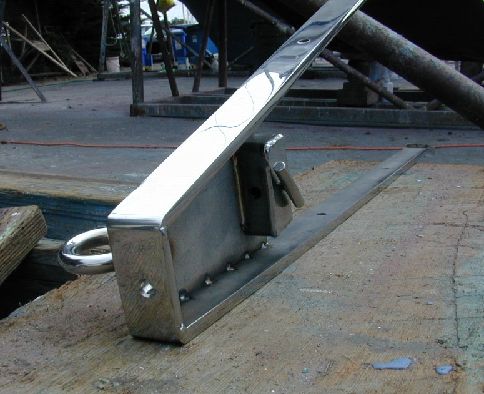 A view of the underside. The hole and thumbscrew is for inserting a 1/4" round batten to catch the lazy sheet so it can't easily fall under the bow while doing outside jibes. |