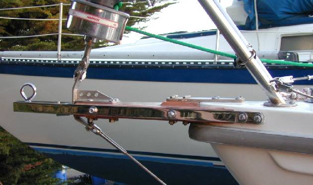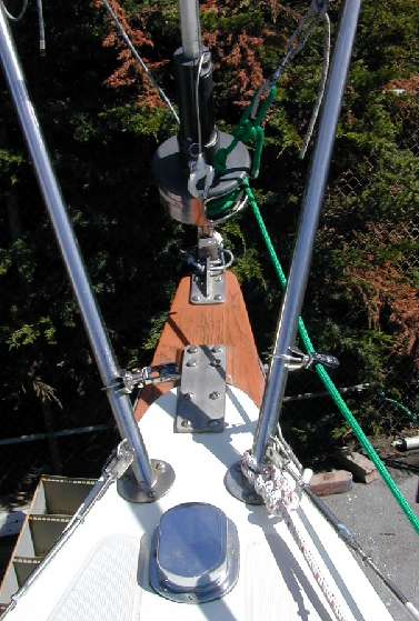 The new bowsprit is much stronger than the original one installed by the manufacturer in 1977. It was designed to accomodate the rigging requirements for flying a modern asymmetic cruising spinnaker.
