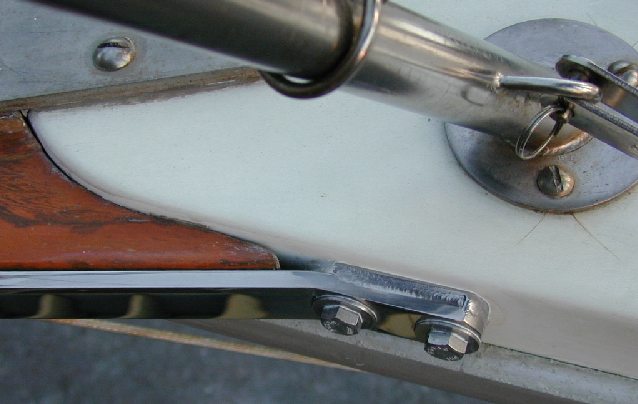Detail of shim needed to fit the stainless bowsprit precisely to both the hull and the wood. |