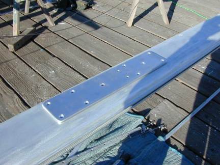 Bad news! Here's what I found hidden underneath the new stainless steel spreader bracket on the port side. The bottom-most hole (below the spreader cup) is elongated (as are the other two, but less obviously), and the mast is compressed about 1/8" right where the bottom hole was. I'm VERY glad I decided to inspect the mast -- this was a mast failure just waiting to happen. Those elongated holes permitted the whole spreader bracket to move with every shock to the mast, and the bolts were "egging-out" the holes. Folks have emailed me to ask it the mast failed from compression under the spreader bracket. The answer is probably "No". In fact, the factory-recommened compression posts had been installed. I think the holes might have been misaligned when drilled by the factory, or perhaps the bolt threads chewed up the hole, egging it out. As the hole elongated and the axis of the bolt changed, it pulled the wall of the mast in about 1/8". From the looks of things, I suspect the damage was there before one of the previous owner installed the new spreader brackets. Only the area immediately surrounding the elongated bottom hole was dented, not the whole area under the bracket. The spreader bracket itself wasn't bent at all. The mast column itself was not buckled like you'd expect to see from it there had been compression damage. Whoever replaced the OEM aluminum spreader bracekts with the Stainless Steel upgrades just left the damage there, and covered it up with the new brackets. Good news: I can fix it, but it's gonna cost about $200-300 to have an aluminum patch and compression posts fabricated by the metal shop at Svendsen's Boat Works. The shop foreman told me he has sucessfully repaired hundreds (literally!) of masts on old Catalina's (of all lengths). They'll fabricate the parts and I'll do the installation myself, according to their instructions. From my past experience with four (or more) other old masts -- This is the worst I've damage I've ever found on an old mast, but every other old mast I've ever taken apart has shown significant damage from lack of proper owner maintenance. I've found holes enlarged from galvanic corrosion (shoulda used some goop to insulate the steel bolt from the aluminum), egged-out holes from bolts that were too long (the threads were wearing the spar wall), missing compression tubes, etc. A word to the wise -- inspect your mast when you first buy a used boat, and inspect and maintain it regularly.
