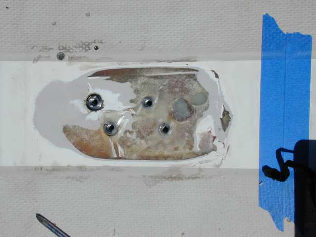 I also filled in the old thru-deck holes for the VHF coaxial cable, the OEM mast wiring (which was not marine grade), and the deck hardware the previous owners had installed -- I filled them all with thickened epoxy, after cleaning the out old sealant with a drill bit. I found no rot under the old maststep or around any of the holes I filled. It's all quite solid under there, even though the old screw went directly into uncoated plywood core with some polysulfide caulking. There is no exposed woodgrain now under the mast step. All fasteners are seated in solid epoxy and fiber fillets. There should be virtually no chance of core rot in the future. Finally, I used waterproof epoxy putty to fair the area resonably flat. |
